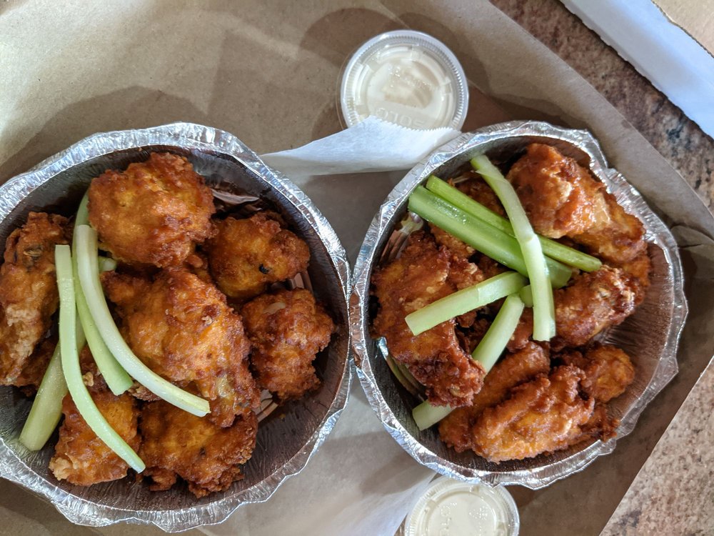 8 pieces. Mild or hot with bleu cheese dressing on the side.